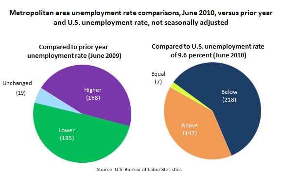 In June, 128 metropolitan areas reported jobless rates of at least 10.0 percent, down from 145 areas a year earlier, while 60 areas posted rates below 7.0 percent, up from 54 areas in June 2009.