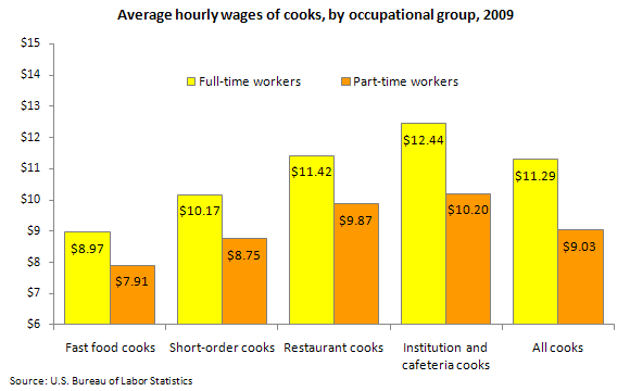 These data are from the National Compensation Survey. To learn more, see "Wages of Full-time and Part-time Cooks: A Multicity Tour" in Compensation and Working Conditions. In the survey, full- or part-time status is determined by whether the employer considers the employee to be working full time or part time, not on the number of hours worked. The national estimates for cooks in 2009 have an average reference month of July.