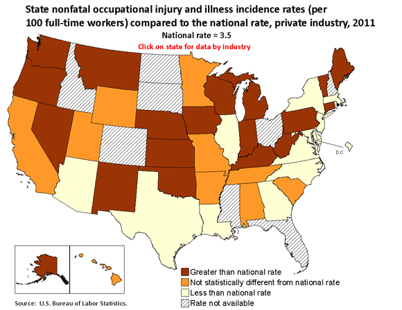 Bureau of Labor Statistics, U.S. Department of Labor, The Economics Daily, State nonfatal occupational injury and illness incidence rates, private industry, 2011 at https://www.bls.gov/opub/ted/2012/ted_20121205.htm (visited December 18, 2025).