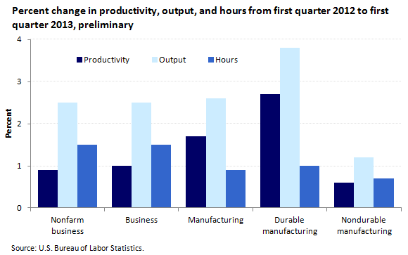 From the first quarter of 2012 to the first quarter of 2013, nonfarm business sector labor productivity increased 0.9 percent. The increase in productivity reflects increases of 2.5 percent in output and 1.5 percent in hours.
