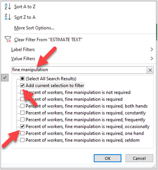 Search for the first estimate you wish to analyze by placing keywords in the text box below Value Filters. Select the estimate(s).