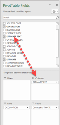 In the PivotTable Fields area, grab and drag the following fields to the following areas: