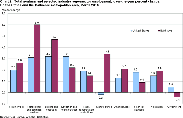 Industry employmentProfessional and business services had the largest annual job gain among Baltimore’s supersectors, adding 13,200 jobs since March 2015. The 6.0-percent local rate of job growth was nearly double the national rate of 3.1 percent. (See chart 2.)