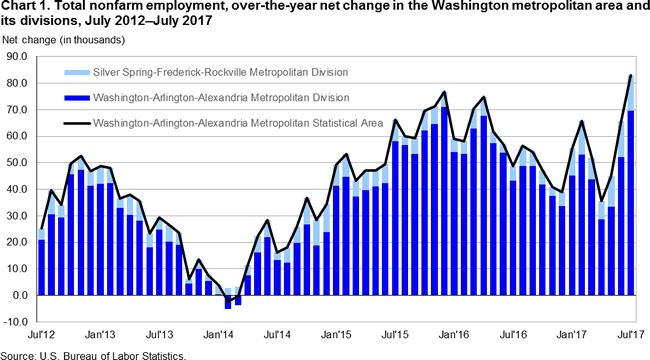 Total nonfarm employment for the Washington-Arlington-Alexandria, D.C.-Va.-Md.-W.Va. Metropolitan Statistical Area stood at 3,321,500 in July 2017, up 83,100, or 2.6 percent, over the year, the U.S. Bureau of Labor Statistics reported today. During the same period, the national job count increased 1.5 percent. Sheila Watkins, the Bureau’s regional commissioner, noted that the Washington area’s July increase was its 40th consecutive over-the-year employment gain. (See chart 1 and table 1; Technical Note at end of release contains metropolitan area definitions. All data in this release are not seasonally adjusted; accordingly, over-the-year analysis is used throughout.)