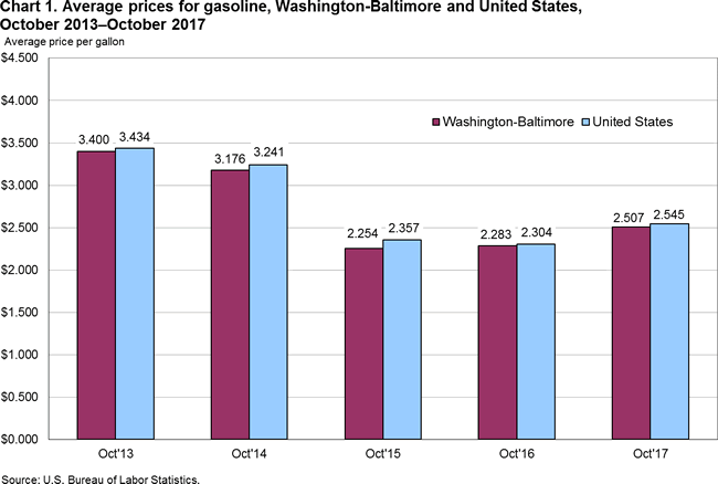 At $2.507 a gallon, Washington area consumers paid close to the national average of $2.545 for a gallon of gasoline in October 2017. Last October, gasoline prices in Washington were also close to the national average. From 2013 to 2015, prices for a gallon of gasoline in Washington differed from the U.S. average by less than 5.0 percent in October. (See chart 1 and table 1.)