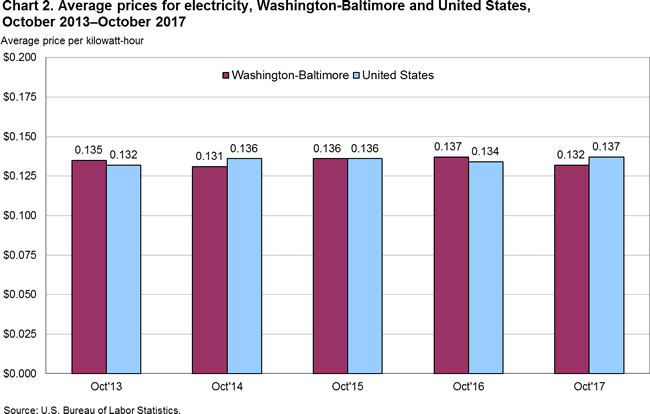 The 13.2 cents per kWh that Washington households paid for electricity in October 2017 was 3.6 percent below the nationwide average of 13.7 cents. Last October, the price per kWh for electricity in Washington was close to the national average. From 2013 to 2015, the price differentials between the Washington area and the national average for electricity ranged from -3.7 to 2.3 percent in October. (See chart 2.)