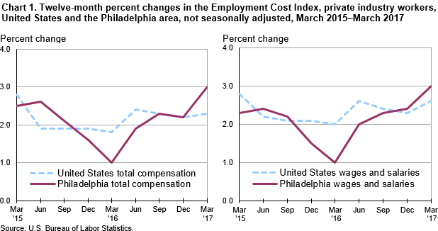Total compensation costs for private industry workers increased 3.0 percent in the Philadelphia-Camden-Vineland, Pa.-N.J.-Del.-Md., metropolitan area for the year ended March 2017, the U.S. Bureau of Labor Statistics reported today. Sheila Watkins, the Bureau’s regional commissioner, noted that one year ago, Philadelphia experienced an annual gain of 1.0 percent in total compensation costs. Locally, wages and salaries, the largest component of total compensation costs, advanced at a 3.0-percent pace for the 12-month period ended March 2017. Nationwide, total compensation costs rose 2.3 percent over the year and wages and salaries advanced by 2.6 percent. (See chart 1 and table 1.)