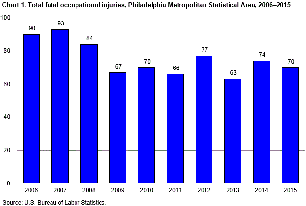 Fatal work injuries totaled 70 in 2015 for the Philadelphia-Camden-Wilmington, Pa.-N.J.-Del.-Md. Metropolitan Statistical Area, the U.S. Bureau of Labor Statistics reported today. Sheila Watkins, the Bureau’s regional commissioner, noted that the number of work-related fatalities in the Philadelphia metropolitan area decreased by four from the previous year. Fatal occupational injuries in the metropolitan area have ranged from a high of 93 in 2004 and 2007 to a low of 63 in 2013. (See chart 1.)