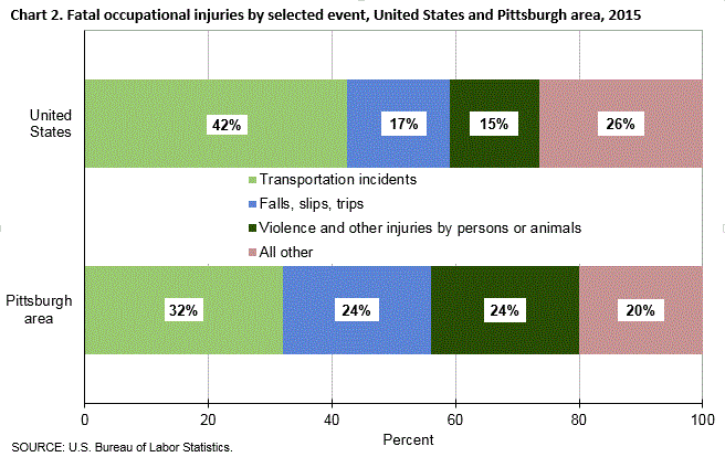 Fatal work injuries totaled 25 in 2015 for the Pittsburgh, Pa. Metropolitan Statistical Area, the U.S. Bureau of Labor Statistics reported today. Sheila Watkins, the Bureau’s regional commissioner, noted that the number of work-related fatalities in the Pittsburgh area increased by seven from the previous year. Fatal occupational injuries in the Pittsburgh area have ranged from a high of 45 in 2008 to a low of 18 in 2014. (See chart 1.)