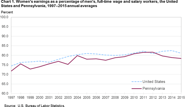 In 2015, Pennsylvania women who were full-time wage and salary workers had median usual weekly earnings of $723, or 78.4 percent of the $922 median usual weekly earnings for their male counterparts, the U.S. Bureau of Labor Statistics reported today. Regional Commissioner Sheila Watkins noted that the women’s to men’s earnings ratio in Pennsylvania decreased 0.4 percentage point from the previous year. Nationwide, women earned $726 per week, or 81.1 percent of the $895 median for men. (See table 1. Earnings in this report do not control for many factors that can be significant in explaining earnings differences.)