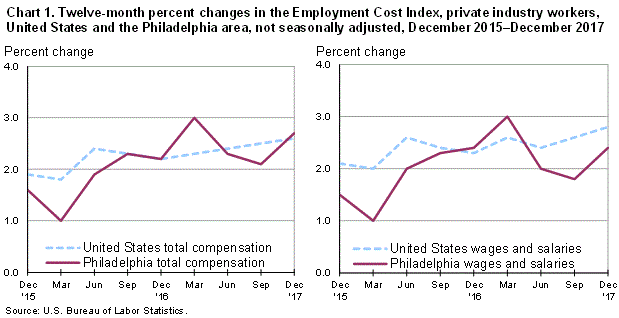 Total compensation costs for private industry workers increased 2.7 percent in the Philadelphia-Camden-Vineland, Pa.-N.J.-Del.-Md., metropolitan area for the year ended December 2017, the U.S. Bureau of Labor Statistics reported today. Sheila Watkins, the Bureau’s regional commissioner, noted that one year ago, Philadelphia experienced an annual gain of 2.2 percent in total compensation costs. Locally, wages and salaries, the largest component of total compensation costs, advanced at a 2.4-percent pace for the 12-month period ended December 2017. Nationwide, total compensation costs rose 2.6 percent over the year and wages and salaries advanced by 2.8 percent. (See chart 1 and table 1.)