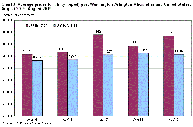 The price paid by Washington area consumers for utility (piped) gas, commonly referred to as natural gas, was $1.337 per therm in August, 29.3 percent above the national average of $1.034 per therm. From 2015 to 2018, the price for utility (piped) gas in the Washington area ranged from 11.1 to 32.6 percent higher than the national average in August. (See chart 3.)