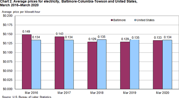 The 13.3 cents per kWh that Baltimore households paid for electricity in March 2020 was close to the nationwide average cost of 13.4 cents per kWh. Last March, electricity prices in Baltimore were 4.4 percent lower than the nation. From 2016 to 2018, prices paid by Baltimore-area consumers for electricity in March differed from the U.S. average by 4.4 percent lower to 11.2 percent higher. (See chart 2.)