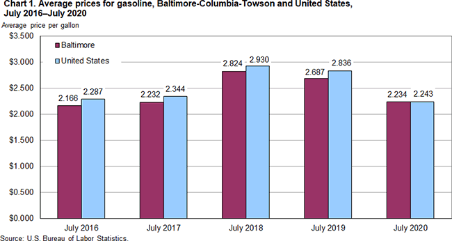 At $2.234 per gallon, the price for gasoline in the Baltimore area was close to the national average of $2.243 per gallon in July 2020. Gasoline prices in the Baltimore area were below the national average in July for the previous four years, ranging from 3.6 percent to 5.3 percent lower. (See chart 1 and table 1.)