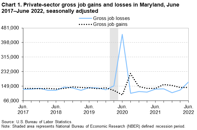 From March 2022 to June 2022, gross job losses from closing and contracting private-sector establishments in Maryland were 173,246, while gross job gains from opening and expanding private-sector establishments were 142,056, the U.S. Bureau of Labor Statistics reported today. Regional Commissioner Alexandra Hall Bovee noted that the difference between the number of gross job gains and the number of gross job losses yielded a net employment loss of 31,190 jobs in the private sector during the second quarter of 2022. During the previous quarter, gross job gains exceeded gross job losses by 15,578. (See chart 1.)