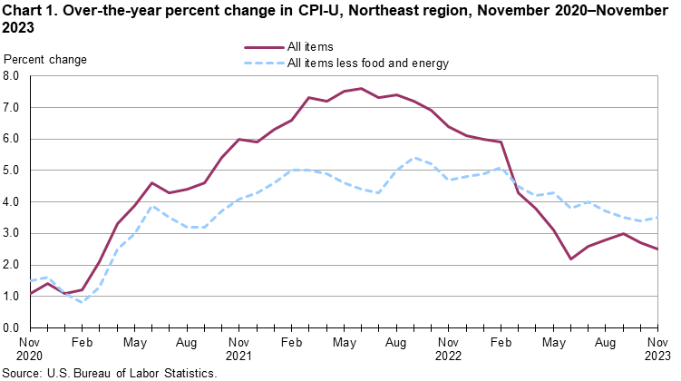 Over the last 12 months, the Northeast all items CPI-U index increased 2.5 percent. The November advance was primarily due to a 3.5-percent rise in the all items less food and energy index, which was led by increases within the shelter index. The food index rose 2.7 percent—the smallest rise in 2023 so far—as increases continued to moderate since the year began. The energy index decreased 7.8 percent and has been lower than the year before every month since March. (See table 1.) Since March 2023, the 12-month change in the all items index has been lower than the all items less food and energy index. (See chart 1.)