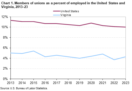 In 2023, union members accounted for 4.3 percent of wage and salary workers in Virginia, compared with 3.7 percent in 2022, the U.S. Bureau of Labor Statistics reported today. Regional Commissioner Alexandra Hall Bovee noted that the union membership rate for the state was at its peak in 1992, when it averaged 9.3 percent, and at its low point in 2007 and 2022 at 3.7 percent. (See chart 1 and table A.) Nationwide, union members accounted for 10.0 percent of employed wage and salary workers in 2023. The rate was little changed from the previous year. Since 1989, when comparable state data became available, union membership rates in Virginia have been below the U.S. average union membership by at least 5 percentage points.
