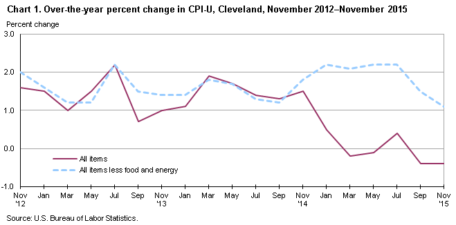 Over the past 12 months the Cleveland area all items CPI-U declined 0.4 percent. (See chart 1 and table A.) The energy index fell 16.0 percent from its November 2014 level due to decreases in gasoline prices and utility (piped) gas service costs over the year. The index for all items less food and energy rose 1.1 percent over the past 12 months. (See table 1.)