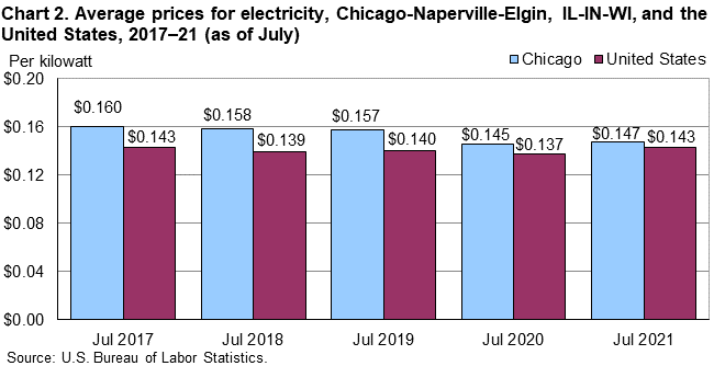 The 14.7 cents per kWh that Chicago households paid for electricity in July 2021 was similar to the national average cost of 14.3 cents per kWh. In Chicago, average electricity costs were higher than the national average in the previous four years (2017-2020) in July, ranging from 5.8 percent to 13.7 percent more. (See chart 2.)