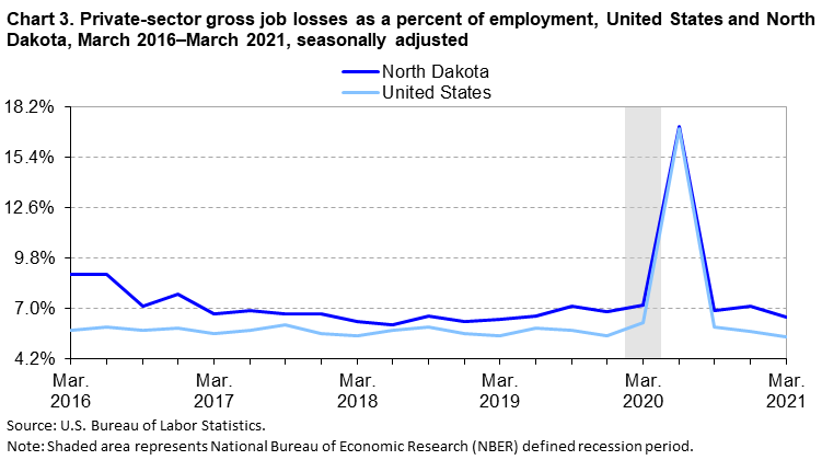 Gross job gainsIn the first quarter of 2021, gross job gains represented 7.8 percent of private-sector employment in North Dakota; nationally, gross job gains accounted for 6.8 percent of private-sector employment. (See chart 2.) Gross job gains are the sum of increases in employment due to expansions at existing establishments and the addition of new jobs at opening establishments. In North Dakota, gross job gains at expanding establishments totaled 21,401 in the first quarter of 2021, an increase of 2,288 jobs compared to the previous quarter. (See table 1.) Opening establishments accounted for 4,028 jobs gained in the first quarter of 2021, a decrease of 72 jobs from the previous quarter.