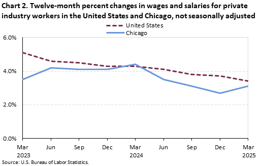 Compensation costs for private industry workers increased 3.2 percent in the Chicago-Naperville, IL-IN-WI Combined Statistical Area (CSA) for the year ended March 2025, the U.S. Bureau of Labor Statistics reported today. Acting Regional Commissioner Julie Wilson noted that one year ago, Chicago experienced an annual gain of 4.3 percent in compensation costs. (See chart 1 and table 1.) Nationwide, compensation costs rose 3.4 percent in March 2025.