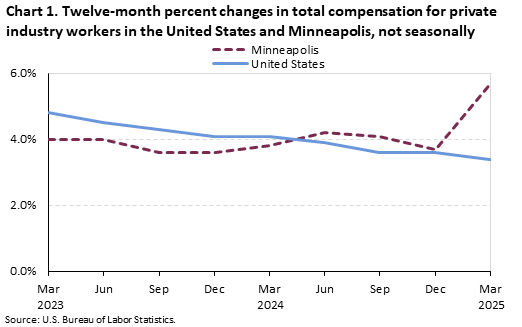Compensation costs for private industry workers increased 3.7 percent in the Minneapolis-St. Paul, MN-WI Combined Statistical Area (CSA) for the year ending in September 2025, the U.S. Bureau of Labor Statistics reported today. Acting Regional Commissioner Bryan Droste noted that one year ago, Minneapolis experienced an annual gain of 4.1 percent in compensation costs. (See chart 1 and table 1.) Nationwide, compensation costs rose 3.5 percent in September 2025.