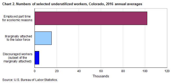 Colorado had 95,300 unemployed residents in 2016 according to the CPS. In addition, there were 102,000 workers who were employed part time for economic reasons (also known as involuntary part time). These individuals were working part time because of slack work or business conditions, or because they were unable to find a full-time job. (See chart 2.) Nationwide, there were 5.9 million individuals working part time for economic reasons in 2016.