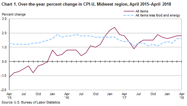 The CPI-U for the Midwest advanced 1.8 percent from April 2017 to April 2018. (See chart 1 and table A.) The energy index, which includes motor fuel and household fuels, rose 5.3 percent and food prices increased 1.3 percent. Excluding food and energy, the CPI-U was up 1.6 percent over the year. (See table 1.)