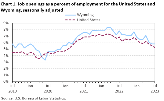 Wyoming had 18,000 job openings in July 2023, unchanged from June, the U.S. Bureau of Labor Statistics reported today. (See table 1.) Assistant Commissioner for Regional Operations Michael Hirniak noted that the job openings rate in Wyoming was 5.8 percent in July, unchanged from the previous month. (See chart 1 and table 2.) The job openings rate nationally was 5.3 percent in July and 5.5 percent in June. (See table 3.) All data in this release are seasonally adjusted.