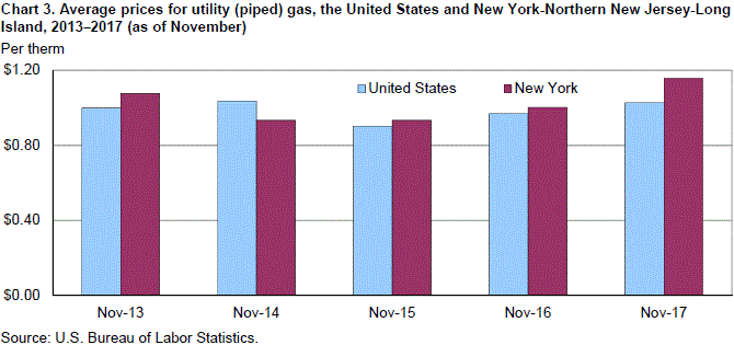 The average price paid in November 2017 by New York area consumers for utility (piped) gas, commonly referred to as natural gas, was $1.158 per therm, 13 percent more than the national average of $1.028. In 2016, area consumers paid close to the national average for a therm of natural gas. In four of the past five years, the per-therm cost for natural gas in the New York in November was within 10 percent of than the U.S. average.(See chart 3.)