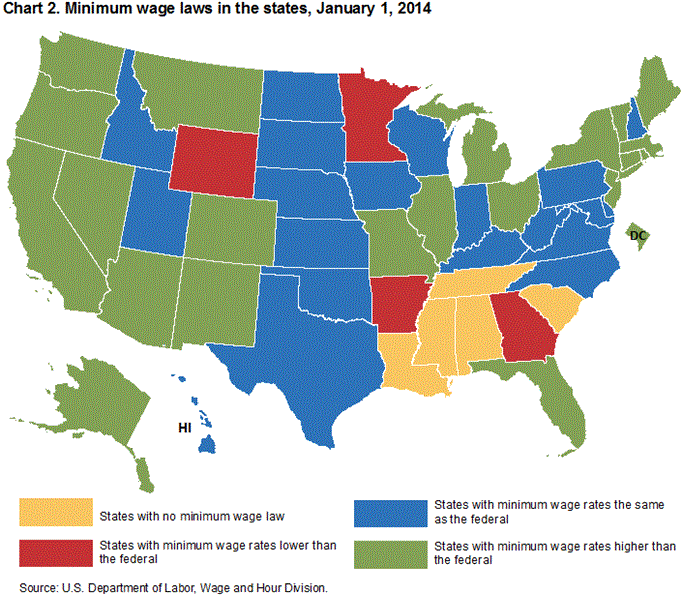 In 2013, New Hampshire’s proportion of hourly-paid workers earning at or below the prevailing federal minimum wage was the seventh-lowest among the 50 states and the District of Columbia. Tennessee had the highest proportion of hourly-paid workers earning at or below the prevailing federal minimum wage, 7.4 percent, followed by Idaho at 7.1 percent. The states with the lowest percentage of workers earning the federal minimum or below included Oregon, California, and Washington, all less than 2.0 percent. It should be noted that, as of January 1, 2014, 21 states and the District of Columbia had laws establishing minimum wage standards that exceeded the federal level of $7.25 per hour. (See table 1 and chart 2.)
