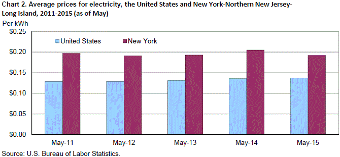 The 19.2 cents per kWh New York households paid for electricity in May 2015 was 40.1 percent more than the national average of 13.7 cents per kWh. Last May, electricity prices were 50.7 percent higher in New York compared to the nation. In fact, from 2011 to 2014, local area electricity prices in May exceeded the nationwide average by at least 47 percent. (See chart 2.)
