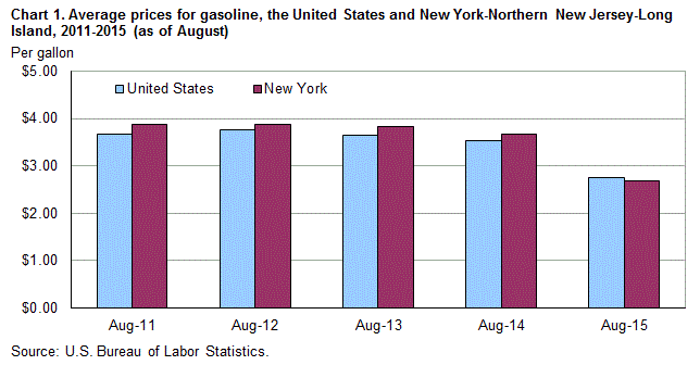 Gasoline prices averaged $2.683 per gallon in the New York-Northern New Jersey-Long Island area in August 2015, the U.S. Bureau of Labor Statistics reported today. Chief Regional Economist Martin Kohli noted that gasoline prices were down $0.989 compared to last August when area households paid $3.672 per gallon. The average price of utility (piped) gas, at $0.951 per therm, was also lower than the $1.070 per therm spent last year. Electricity prices averaged 19.8 cents per kilowatt hour (kWh), down from the 20.4 cents per kWh paid in August 2014. (Data in this release are not seasonally adjusted; accordingly, over-the-year-analysis is used throughout.)