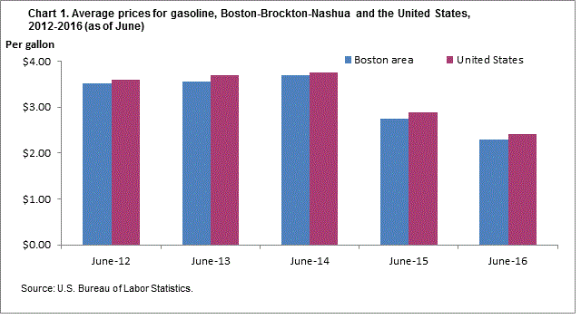 Boston area households paid an average of $2.300 a gallon for gasoline in June 2016, the U.S. Bureau of Labor Statistics reported today. Regional Commissioner Deborah A. Brown noted that this was more than $0.45 below the June 2015 price of $2.757 per gallon. Utility (piped) gas prices averaged $1.006 per therm in the Boston area in June 2016. Area natural gas prices were up from one year ago when they averaged $0.850 per therm. The average cost of electricity at 18.8 cents per kilowatt hour (kWh) in June was down slightly from 19.9 cents per kWh spent last year. (Data in this release are not seasonally adjusted; accordingly, over-the-year-analysis is used throughout.)