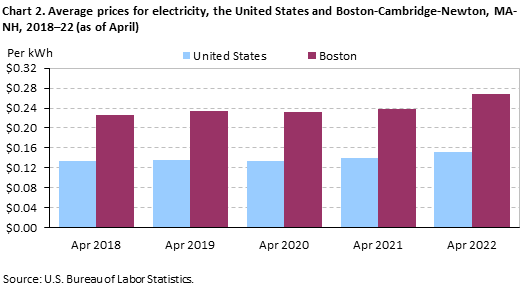 The 26.8 cents per kWh that Boston households paid for electricity in April 2022 was 77.5 percent higher than the nationwide average cost of 15.1 cents per kWh. Last April, electricity costs in Boston were 71.2 percent higher than the nation. Boston area electricity costs have exceeded the national average by at least 67.9 percent over the past five Aprils. (See chart 2.)