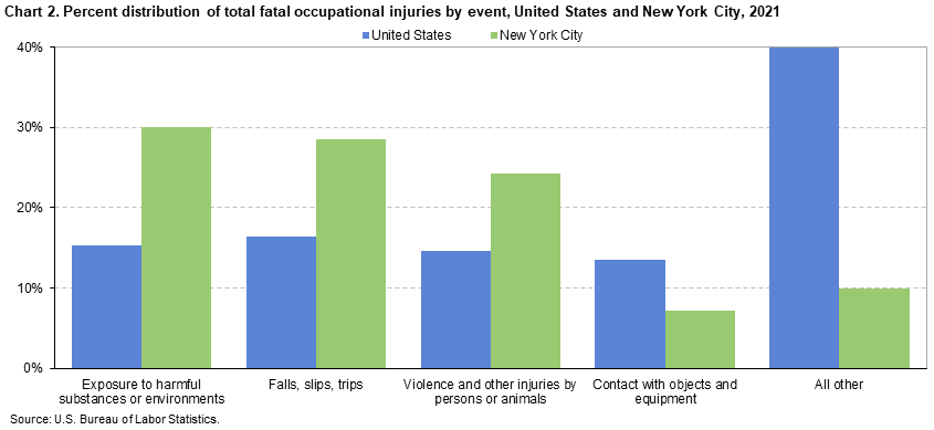 Fatal event or exposureIn New York City, exposure to harmful substances or environments resulted in 21 fatal work injuries, and falls, slips, and trips accounted for 20 fatalities. These two major categories accounted for 59 percent of all fatal workplace injuries in the city. (See chart 2 and table 1.) Worker deaths from exposure to harmful substances or environments were up from 17 in 2020. Of the 21 fatalities resulting from harmful exposures in 2021, 17 involved nonmedical use of drugs or alcohol—unintentional overdose. Worker fatalities due to falls, slips, or trips were up from 13 during the previous year.