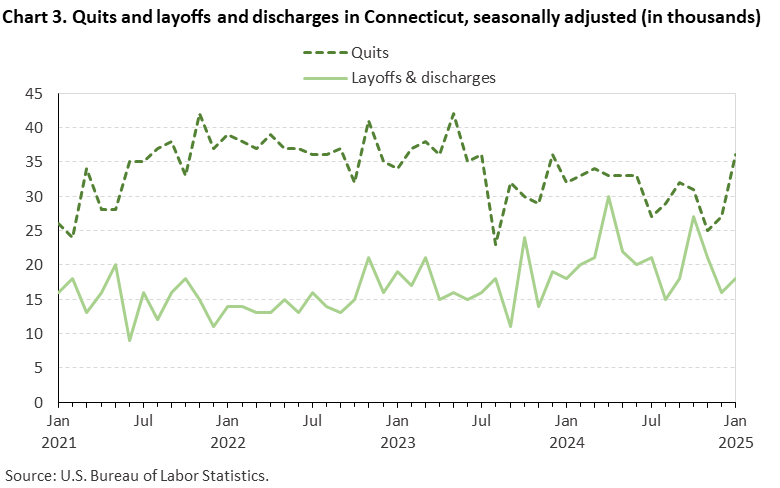 Among the July separations in Connecticut, 23,000 were quits and 25,000 were layoffs and discharges, compared to 39,000 quits and 21,000 layoffs and discharges in June. (See chart 3.) Over the year, quits averaged 30,000 per month, ranging from 23,000 to 39,000. Layoffs and discharges have averaged 20,000 per month, ranging from 15,000 to 27,000.