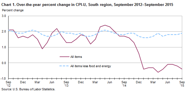 The Consumer Price Index for All Urban Consumers (CPI-U) for the South edged down 0.2 percent in September, the U.S. Bureau of Labor Statistics reported today. The energy index declined by 4.8 percent over the month. The all items less food and energy index rose 0.3 percent and the food index edged up 0.2 percent in September. (Data in this report are not seasonally adjusted. Accordingly, month-to-month changes may reflect the impact of seasonal influences.)