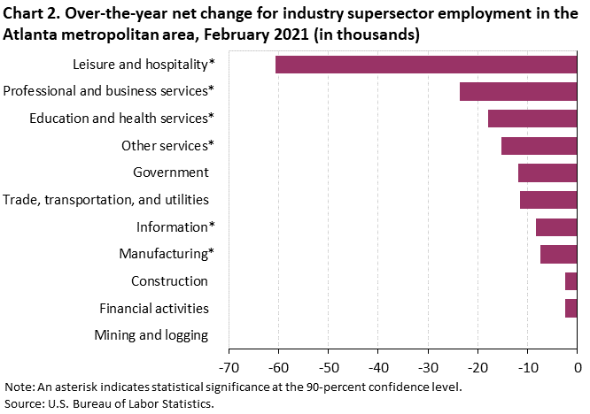 Total nonfarm employment for the Atlanta-Sandy Springs-Roswell, GA Metropolitan Statistical Area stood at 2,706,300 in February 2021, down 161,600, or 5.6 percent, over the year, the U.S. Bureau of Labor Statistics reported today. During the same period, the national job count declined 5.9 percent. (See chart 1 and table 1.) Regional Commissioner Janet S. Rankin noted that this was the 11th consecutive month of over-the-year declines in the Atlanta area. (The Technical Note at the end of this release contains metropolitan area definitions. All data in this release are not seasonally adjusted; accordingly, over-the-year analysis is used throughout.)