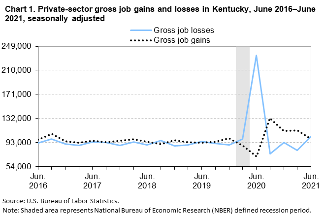 From March 2021 to June 2021, gross job gains from opening and expanding private-sector establishments in Kentucky were 99,257, while gross job losses from closing and contracting private-sector establishments were 102,580, the U.S. Bureau of Labor Statistics reported today. Regional Commissioner Janet S. Rankin noted that the difference between the number of gross job gains and the number of gross job losses yielded a net employment loss of 3,323 jobs in the private sector during the second quarter of 2021. During the previous quarter, gross job gains exceeded gross job losses by 32,411. (See chart 1.)