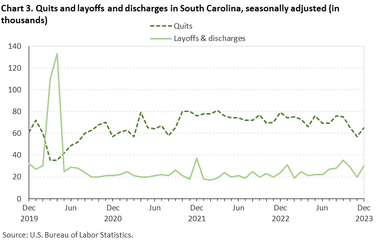 Among the December separations in South Carolina, 65,000 were quits and 30,000 were layoffs and discharges, compared to 57,000 quits and 20,000 layoffs and discharges in November. (See chart 3.) Over the last 12 months, quits averaged 70,000 per month, ranging from 57,000 to 76,000. Layoffs and discharges have averaged 26,000 per month, ranging from 19,000 to 35,000.