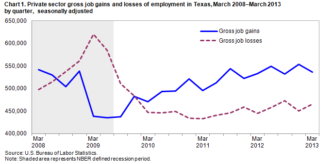 From December 2012 to March 2013 gross job losses in private sector establishments in Texas totaled 465,576, the U.S. Bureau of Labor Statistics reported today. Regional Commissioner Stanley W. Suchman noted this total job loss was an increase of 15,217 from the previous quarter. Gross job gains numbered 537,115 in the first quarter of 2013. Due to an administrative change in the education and health services industry sector, current gross job gains are not comparable to data from previous quarters. (See box note.) During the prior quarter, gross job gains in the state exceeded gross job losses by more than 100,000.