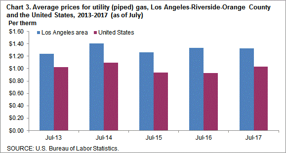 Prices paid by Los Angeles area consumers for utility (piped) gas, commonly referred to as natural gas, were $1.325 per therm, or 28.5 percent more compared to the national average in July 2017 ($1.031 per therm). A year earlier, area consumers paid 43.2 percent more per therm for natural gas compared to the nation. In the Los Angeles area over the past five years, the per therm cost for natural gas in July has varied between 20.9 and 43.2 percent above the U.S. average. (See chart 3.)