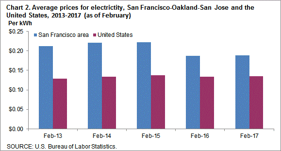 The 18.9 cents per kWh San Francisco households paid for electricity in February 2017 was 40.0 percent more than the nationwide average of 13.5 cents per kWh. Last February, electricity costs were 39.6 percent higher in San Francisco compared to the nation. In each of the past five years, prices paid by San Francisco area consumers for electricity exceeded the U.S. average by at least 39.6 percent in the month of February. (See chart 2.)