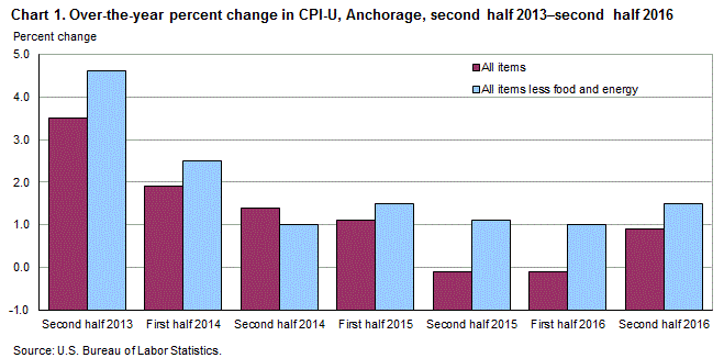 Prices in the Anchorage Area, as measured by the Consumer Price Index for All Urban Consumers (CPI-U), increased 0.8.percent in the second half of 2016, the U.S. Bureau of Labor Statistics reported today. (See table A.) Assistant Commissioner for Regional Operations Richard Holden noted this latest six-month increase was influenced by higher prices for and gasoline and medical care. (Data in this report are not seasonally adjusted. Accordingly, six-month-to-six-month changes may reflect seasonal influences.)