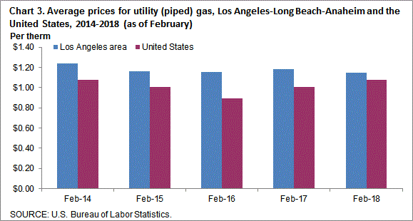 Gasoline prices averaged $3.402 a gallon in the Los Angeles-Long Beach-Anaheim area in February 2018, the U.S. Bureau of Labor Statistics reported today. Assistant Commissioner for Regional Operations Richard Holden noted that area gasoline prices were higher than last February when they averaged $2.925 per gallon. Los Angeles area households paid an average of 18.1 cents per kilowatt hour (kWh) of electricity in February 2018, similar to the 18.4 cents per kWh paid in February 2017. The average cost of utility (piped) gas at $1.148 per therm in February was lower than the $1.182 per therm spent last year. (Data in this release are not seasonally adjusted; accordingly, over-the-year-analysis is used throughout.)