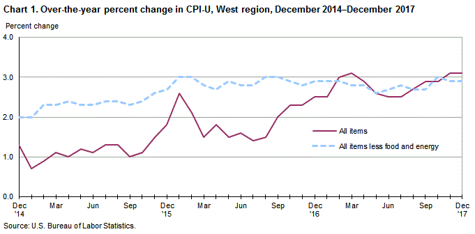 Prices in the West Region, as measured by the Consumer Price Index for All Urban Consumers (CPI-U), inched up 0.1 percent in December, the U.S. Bureau of Labor Statistics reported today. (See table A.) The December increase was influenced by higher prices for shelter and food. (Data in this report are not seasonally adjusted. Accordingly, month-to-month changes may reflect seasonal influences.)