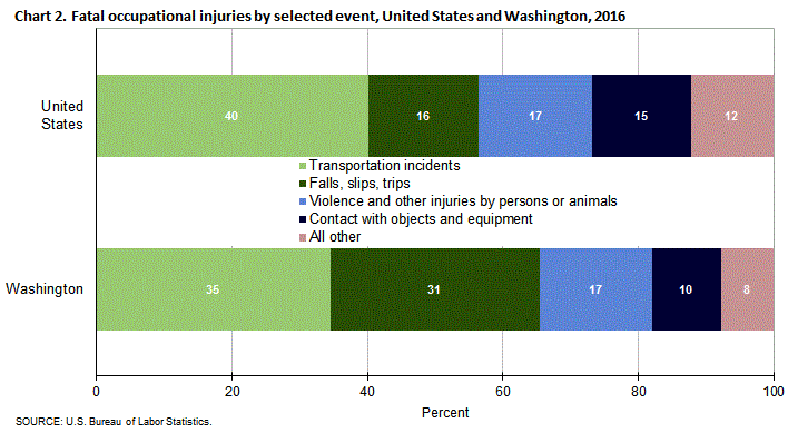 Nationally, transportation incidents were the most frequent fatal workplace event in 2016, accounting for 40 percent of fatal work injuries. (See chart 2.) Violence and other injuries by persons or animals was the second-most common fatal event (17 percent), followed by falls, slips, or trips (16 percent).
