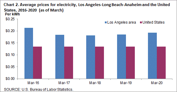 The 19.3 cents per kWh Los Angeles households paid for electricity in March 2020 was 44.0 percent more than the nationwide average of 13.4 cents per kWh. Last March, electricity costs were 37.0 percent higher in Los Angeles compared to the nation. In the past five years, prices paid by Los Angeles area consumers for electricity exceeded the U.S. average by 34.1 percent or more in the month of March. (See chart 2.)