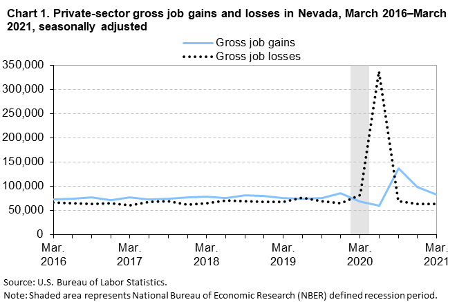 From December 2020 to March 2021, gross job gains from opening and expanding private-sector establishments in Nevada were 83,087, while gross job losses from closing and contracting private-sector establishments were 62,689, the U.S. Bureau of Labor Statistics reported today. Regional Commissioner Chris Rosenlund noted that the difference between the number of gross job gains and the number of gross job losses yielded a net employment gain of 20,398 jobs in the private sector during the first quarter of 2021. During the previous quarter, gross job gains exceeded gross job losses by 34,116. (See chart 1.)